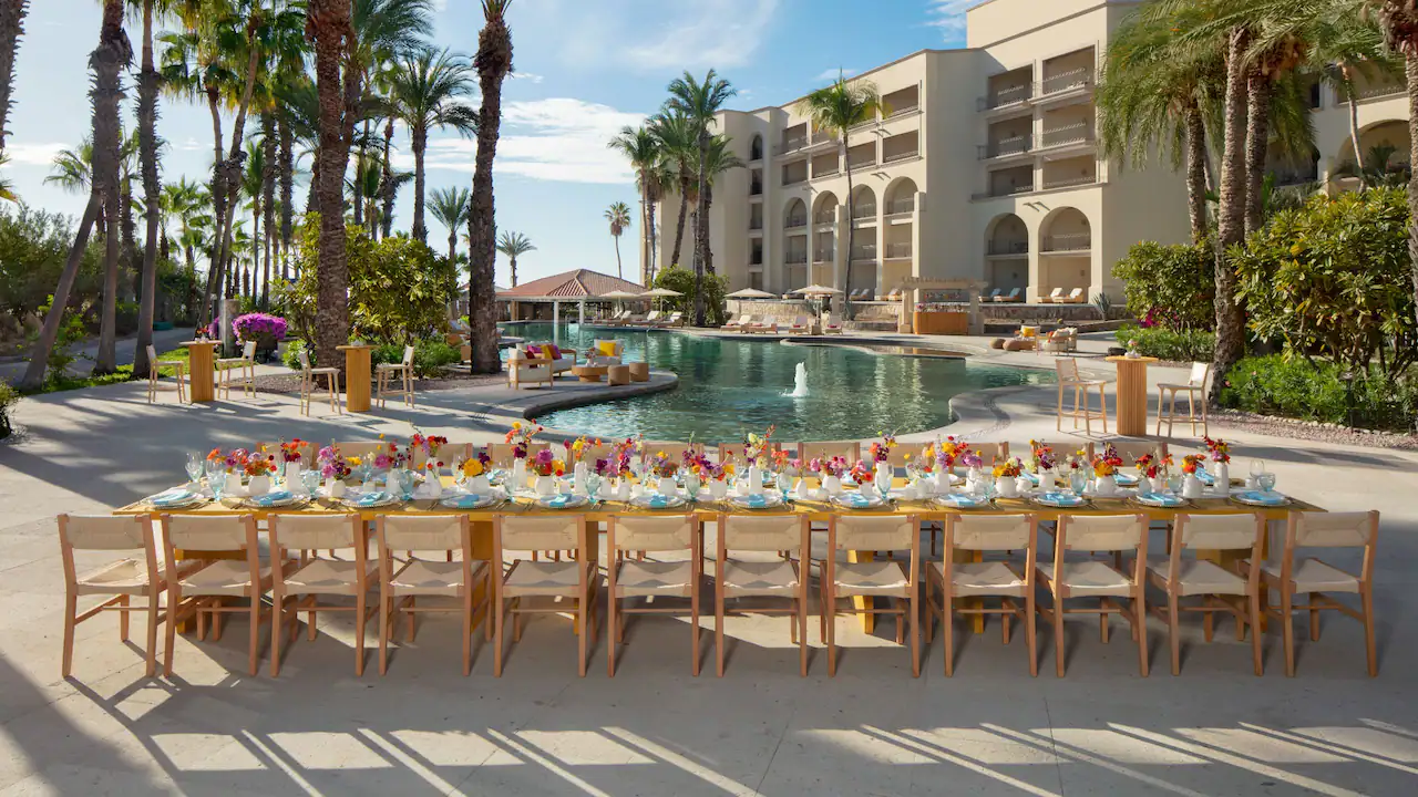 Located on the Sea of Cortez, offers a luxurious experience with 272 suites featuring private balconies or terraces and stunning ocean views. The resort includes three pools: an infinity pool, a children’s pool, and an adults-only pool, all with swim-up bars. Dining options abound with eight restaurants, including à la carte options, a buffet, a grill, and a café, complemented by four bars serving premium beverages. Amenities include a full-service spa, a fitness center, and the Explorer’s Club for kids. Guests can enjoy activities such as whale watching (seasonal), theme nights, tequila tastings, and tennis. The resort’s colonial Mexican design and proximity to golf courses, Cabo San Lucas, and San José del Cabo make it an excellent choice for families and couples alike.